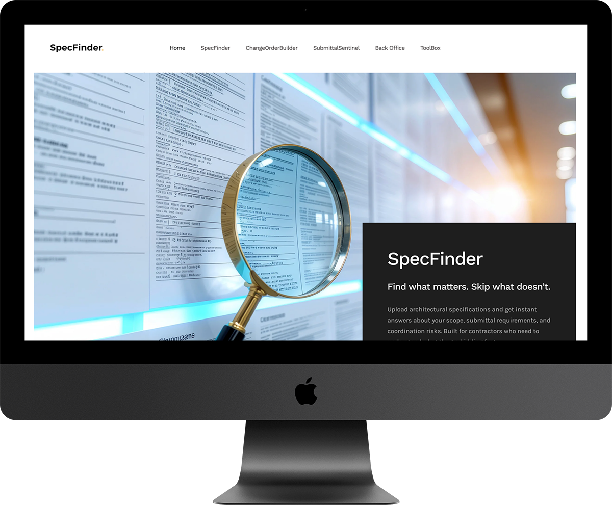 SpecFinder is a live example of what we build. Your tools, your brand, one site. This is what yours could look like.